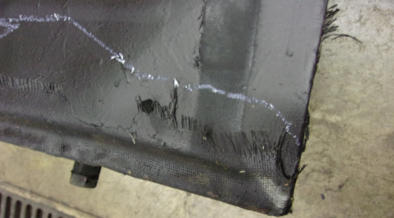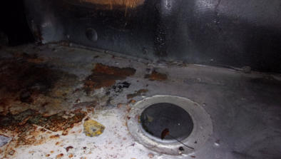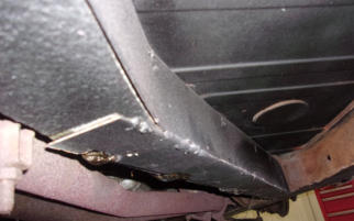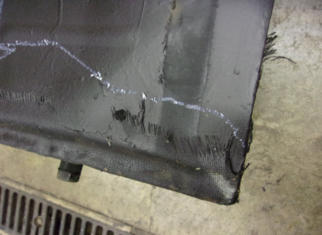 Here we have the lower edge of a TR3A gas tank. Look closely and you can see that the lower section of the tank has been covered in a layer of fiberglass, and this “repair” was applied along the entire bottom of the tank. It’s no wonder that the owner complained of a strong gas smell coming from his recently acquired and previously “restored” TR3A! Whomever performed the “restoration” on this car in the past must have used fiberglass as their rust repair of choice, because we’ve also noticed it poking through numerous rust holes in the floors!Many of you who are facing a rusty gas tank will opt to order a new replacement tank, but I want to present you with another option. We prefer to send all of our original gas tanks (no matter how bad they appear) to our nearest Gas-Tank-Renu franchise for repair. They can save even the worst original tanks at a cost that is usually less than the price of a new tank, AND the original tanks fit better than a reproduction tank ever will! The nationwide lifetime warranty they offer is a big plus as well, but in all the years we’ve been using their services we’ve only had one single warranty claim, and it was promptly and cheerfully resolved!