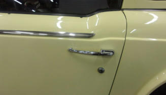 The problem with quick research, is that the first findings you run across might be wrong. Take the position of this chrome spear for example. This TR250 was here for a pre-buy inspection, and this just didn’t look right but I wanted to be positive before including it in my report to the prospective buyer. Whenever I need a memory refresh, I head to our extensive library for help. But imagine my surprise when I opened Piggott’s “Original TR4/4A/5/6” and found photos of two different restored cars, on the same page, and this piece of trim was installed differently on each one! So this shows that you can’t always trust restored cars, as the previous restorer always has a 50/50 chance of getting the details wrong (unless it was restored here!). So how did we decide which one was correct? We continued digging and located several FACTORY photos, and only then could we be certain that the trim strips had been installed upside down on the wrong doors, both here and on the Valencia Blue TR250 shown in Piggott’s book!