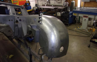 We are well into the restoration of this TR4, and fortunately the owner has been collecting parts and parts cars for many years. He brought us two left front fenders, and both were pretty rough. But fortunately they each had a good end! One was rusted very badly at the rear half, and the front of the other had been used to stop the car against a hard object. The decision to marry the best parts of both was an easy one for our talented metal fabricators.Now if you are going to attempt a project like this, you need to measure about six times before you cut, and then another half dozen or so times before you weld. This entire process took place on and off of the car, using very long straight edges to confirm alignment, and then as a final check it helps to just stand back and visually look down all of the lines before you ever come near it with your welder! And the finished results? In bare metal it’s hard to tell that this fender was made from two, so we have no doubt that the repair will be invisible once the paint has been applied and the restoration is complete.