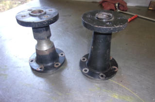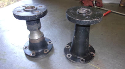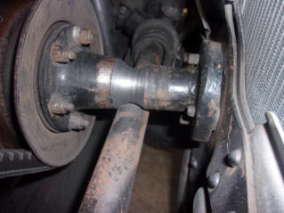 What we have this week is another sad story of an unsuspecting TR owner who paid the local “I can fix any car” mechanic to mess up his Triumph. A couple of months ago, this TR4A broke a fan belt. The owner took the car to a local that he’s been using for general maintenance, and a new belt was installed (along with a new aluminum radiator). Now all of you TR4 owners out there who have done this in the past will know that to get a new belt onto these cars, either the steering rack must be removed, or the engine has to be jacked up. No other way around it. This particular mechanic chose to jack up the engine, but he took the lazy way out and didn’t bother to loosen the motor mount bolts. How do we know this? Because of all the old grease and dirt packed on the motor mount nuts! Unfortunately this “jacking up of the engine” broke both of the front motor mounts, and when the owner picked up the car and drove it home, the motor promptly shifted out of position and fell down, allowing the cast iron hub extension to ride on top of the steering rack. We’ve seen worn hub extensions before, but this one was just about to go through completely, & probably toss the fan blade into the new aluminum radiator!