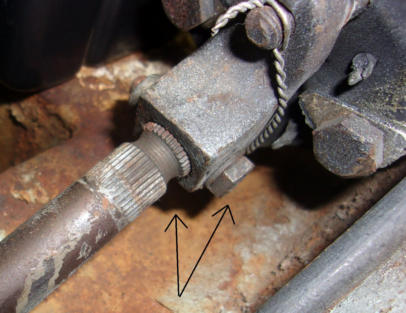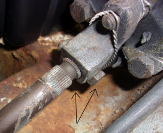Brakes and steering are the two most important safety items on any car, as cars must go where you point them AND be able to stop. This week we’re looking at a steering situation that isn’t very safe! This is the steering shaft of a TR4, up near the firewall where the column enters the engine compartment. The steering components of a TR6 are assembled in the same manner.When assembling a steering column and the associated shafts, the couplers are supposed to slide down onto the splined shafts until the pinch bolt (right arrow) will pass through the smooth groove in the shaft (left arrow). This assures that the coupler is engaged sufficiently onto the shaft, and the pinch bolt running through the shaft groove will make certain that the coupler will not disconnect from the shaft. As someone in the past has failed to notice, the only thing holding this coupling and shaft together is raw friction, and not much of it at that. The bolt is passing above the top of the shaft and it’s just barely hanging on, not nearly as safe as it should be! If you drive a TR4-TR6, please take a look at your steering shaft couplings just to be certain that your steering column is assembled correctly. It’s hard to know what sort of incompetent mechanic worked on it last!