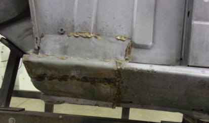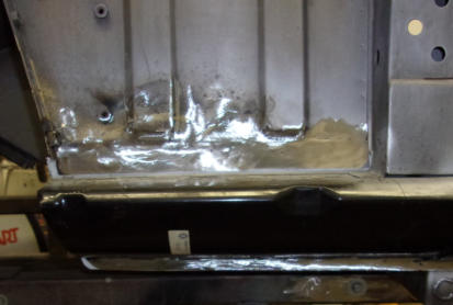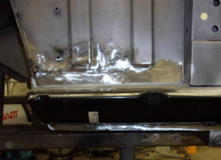 And now we have a properly completed repair. The entire outer sill (rocker panel) has been replaced with a new reproduction part, and the rusty lower section of the bulkhead end panel (kick panel) has been surgically removed and replaced with new metal. After aligning the new patch with the remaining original but solid metal, the pieces were TIG welded together with a continuous butt joint, free of any cracks,voids, or overlaps which might allow moisture in to start the rusting process all over again. We then grind away the excess weld, and leave a repair that will be nearly invisible to anyone who might disassemble this car again 50-60 years from now! Unlike a TR2-3B which has a heavy gauge inner sill to support the door posts and the floors, the only support that a TR4-TR6 body has in this area is a thin sheet metal box which is formed by the inner and outer sills and a small section of the outer floor pan, so it is imperative that any rust in this area is repaired in a manner to assure it is structurally sound. The previous “repair” certainly was not!