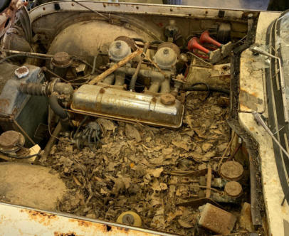 One more to go along with the neglected TR4 from October 7. This one was just too good not to share! Once we were able to get the hood open, we found this gigantic squirrel nest inside the engine bay. When cars are neglected by humans, you can rest assured that they will not be ignored by the animals! We’ve seen our share of nut shells and mouse droppings inside of engine cylinders, and blown plenty of nesting material out of exhaust systems on cars which were coaxed back to life. We’ve also repaired plenty of chewed wiring and interior components, including a TR6 that literally had the entire interior (including the wood dash overlay) eaten by raccoons, but never have we seen an engine bay that was as completely taken over as with this one. Apparently the tarp which was draped over the car did a wonderful job of making the TR4 a nice cozy habitat for the wildlife, not to mention trapping the moisture inside which totalled the car with rust.