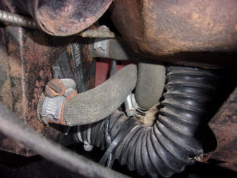 The round black steel rod here (with the paint flaking off), is a TR6 throttle shaft, where it exits the firewall on the left side. This rod is part of the gas pedal, and it runs across the firewall just behind the engine. What’s interesting here is that the small plastic bushing which is supposed to hold the rod as it passes through the firewall (in the middle of the big red “flat washer”) is missing. The opposite end of the rod on the right side of the firewall is also supported by one of these same bushings (also missing on this car), next to the lever where the carburetor linkage is attached. With the passage of time, it’s not uncommon for these bushings to crack and fall out, leaving you with a sloppy gas pedal that won’t fully open the carbs. Many times, when owners bring their cars here with complaints of a “loss of power”, a new set of throttle shaft bushings is all it takes to resolve the problem. But this is the first time we’ve ever seen the battery ground cable used to support the shaft in place of a missing bushing! What will they think of next? Normally, it isn’t a good idea to allow anything near the throttle (or steering) shaft that could snag or prevent unrestricted motion.