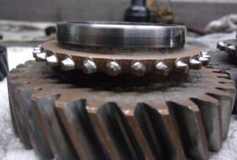 To the untrained eye, and at first glance, this appears to be a “good” TR3 second gear. All of the big teeth are smooth with no nicks or chips, but it’s always the smallest details that matter most. Take a look at the row of tiny teeth above the big ones, and a closer examination shows them to be worn away by nearly half. These smaller “dog” teeth are what actually complete each gear change when they engage with the synchronizer. When your brass synchro cups (rings) get worn to the point that you hear a small grind when changing gears, it’s these small dog teeth that are slowly being destroyed. If this is happening with your own TR, don’t keep driving it! As this damage and wear gets worse, the transmission with start “jumping” out of the affected gear, on downshifts at first, and then as the wear continues it will also jump out during acceleration. Unfortunately there is no spec to measure how much wear is too much, so absent an owner’s complaint or on a car we can’t test drive, we have to rely on the experienced eye of our gearbox specialist to know when a new gear is required.