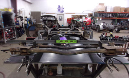 We’ve been doing a pretty good job of repairing rusted and slightly bent frames here with hastily fabricated jigs and guides to suit each different frame needing attention. But lately we’ve seen an increase in the number of frames that have a problem, so we decided to build a special frame table that would allow us to take precision measurements more quickly for comparison to the factory drawings. The solution was a 975# slab of ¾” thick steel that was flat and true, mounted on top of a rigid steel frame and a set of very expensive locking wheels. We drilled and tapped several strategic locations to accept mounting blocks that would elevate the frame a consistent distance above the surface, with provisions to clamp the frames down securely for repeatable measurements throughout the straightening and rust repair process. The first frame to be repaired on this new table came out perfect, and the body dropped back on like butter!
