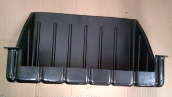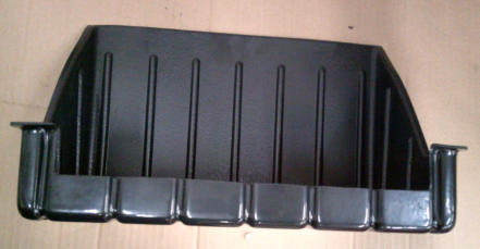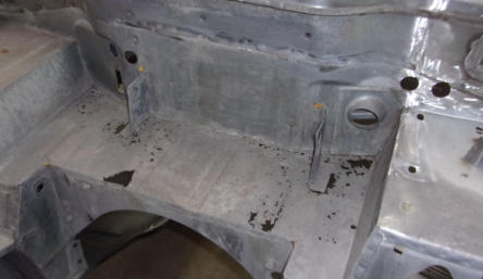 This battery shelf has received a “repair” in the past that isn’t too bad, but still leaves a lot of room for improvement. The flat piece on the bottom was at least bent up along the back edge to seal the rear corner, and brazing (gold spots) assured that it would stay securely in place, but nothing was done about sealing the reinforcement channels in the bottom. Leaving these open will allow heat and fumes from the engine bay to travel back to the rust holes, eventually making their way into the passenger compartment. Even worse are the upper holes at the approximate height of the battery. These come from spilled acid or acid vapor exiting the battery caps, and is generally caused by an over active charging system “boiling” the battery. Now you can see the importance of the tall rear wall of those battery box liners we’ve been talking about! When the firewall rusts out in this upper location, it feeds acid and engine fumes directly into the fresh air plenum, which then directs all this nasty stuff through your heater and dash vents (TR4-6). This is not something you want to have blowing in your face, or breathing through the heater when the windows are up and the heater is cranking out warmth on a cool morning!