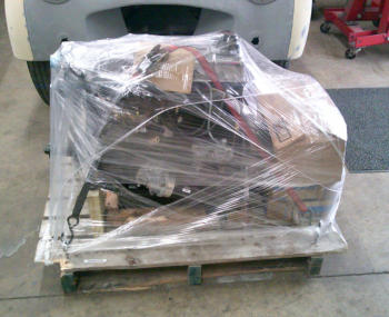 It’s well known throughout the Triumph community that we rebuild a huge amount of TR2-TR6 engines, and many of them are shipped here from all over the USA. For those of you located some great distance from Southwest Ohio, it’s pretty easy to strap an engine onto a pallet and have a freight company take care of the logistics. This is a TR3 engine which we recently overhauled for an owner in FL, all wrapped up and ready to ship home. Usually we’ll receive an engine laying on it’s side (after draining fluids), but we have to be a little more careful for the return journey home. We like to make wooden wedges from 2x6 or 2x8 boards, and bolt the front motor mount tabs to the pallet through them. Those wedges and a couple of diagonal metal straps at the rear (threaded into the block’s bellhousing bolt holes) will keep the engine from rocking side to side and falling over. We’ll also install a few small 2x4 blocks around the 4 flat sides of the oil pan, just to make certain that the engine doesn’t slide around on the pallet. After that, all that’s needed is to strap and shrink wrap the entire assembly, then call the truck. We’ll close this little story by mentioning that this engine arrived home safely 3-4 days after it left our shop. Now you know that there’s really no reason to have your engine rebuilt by anyone with less Triumph experience than is available here at Macy’s Garage. And if you don’t want to remove the engine yourself, you should know that shipping a whole car is actually easier than shipping an engine by itself. Send the whole car and we’ll handle the R&R for you as well!