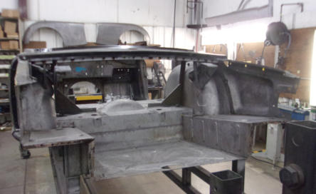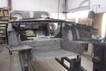 The rear valance (tail pan) on all TR6’s is one of those trouble spots that are extremely rust prone. Fortunately, all of the three panels which make up the area are available, and they fit relatively well too. The trouble with replacing them is that removal of the old rusty pieces leaves the entire rear area of the body tub loose and floppy, so getting all of the new parts to align properly takes extreme care and a precise set of jigs to help with the task. This TR6 will become even more flimsy when the spare tire pan is removed, which is the next step after this photo was taken. Access makes the job go faster, so even though the rear of the tub looses 95% of it’s rigidity, this is the ideal time to replace a needed spare tire pan. You can’t see it in this photo, but the rear deck panel (under the gas cap) has already been replaced, and we did this change well before cutting away the rigidity provided by the rear valance. When it comes time to solidly weld the rear valance panels in place, we’ll be installing the rear fenders and trunk lid and hinges, just as one more additional check to assure perfect alignment. You can’t be too careful when a car is peeled open like this, because there’s nothing worse than getting to final assembly and finding that a hood, trunk, or door won’t close!