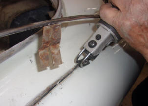 Just about anyone with a few basic tools can tear an old car apart. Whether it ever goes back together again is another matter. Part of that equation is the care and finesse that goes into the disassembly process, as you really should pay close attention that nothing more is damaged in the process. There’s already enough that will need work without creating more by a ”take no prisoners” approach. Destroy some hard to find part through careless disassembly, and your restoration might come to a halt before it really gets started. We like to call our process a “surgical disassembly”, and we take our time to plan and avoid inflicting any additional damage. This photo shows a TR3A which recently arrived for a complete restoration. It has been one of the most difficult disassemblies we’ve ever experienced. Every single bolt holding each of the four fenders needed to be cut off, and here is just one of the tricks we used. A small air saw and a tiny reciprocating blade will just fit between the body tub and the fenders, allowing each of the frozen bolts and spinning cage nuts to be sliced apart without damaging either panel. Time consuming, yes. But so is repairing fenders and body tubs that were carelessly damaged.