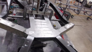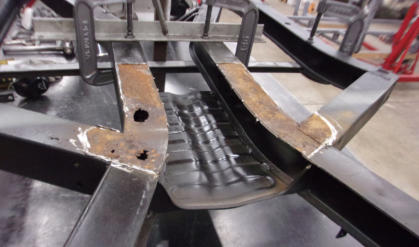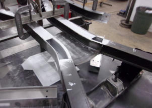 Week two of our 3 week look into this TR6 frame repair. In actual time, this only took 2-3 days and cost the client less than $2000. Much better than the $7k plus he was looking at for a completely new frame (plus options and shipping!). You can plainly see where the weak sections have been removed from the two central rails, and the inside of each box has been cleaned and painted. Look close and compare this to last week’s photo and you can see that both trailing arm mount sections and a large portion of the outer perimeter frame is missing from the upper right corner of this week’s pic. There is no need to be concerned about repairing a frame like this because a close look at any frame will show that they were originally fabricated from many smaller pieces that were welded together. The factory had a jig to hold all of the pieces in alignment before they were welded, and the new frames which are available for that $7k price tag are made by the same exact process. We too have our own flat frame table and jig to hold all of the pieces in alignment, so all frames repaired here will be just as strong and true as a good original or a 100% new frame. The only thing lacking is the high cost!May 28, 2024The Triumph TR4A-TR6 frames are very prone to rust, so much so that we created our own frame table so that we can repair them here. The first place where this rust becomes visible is usually the rear suspension trailing arm mount sections, and digging in to repair those will usually reveal additional “hidden” damage. It’s usually enough to repair while pieces are removed using carefully fabricated sections of the same gauge steel, and TIG welding it all solidly in place. In this week’s photo, only the lower “T-Shirt” in the center has been removed. As the bottom is always going to be where the worst rust happens, we will work most of the repairs with the frame positioned upside-down and firmly secured onto our frame table. Next week we’ll show this same angle again, but after all of the weak and rusty sections have been removed.