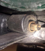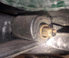 pin, nut, and flat washer, the damage to the rubber spring bushing is quite evident. Old rubber