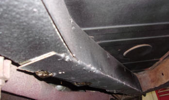 Rusty frames are a common ailment of TR4A-TR6 (IRS cars), and this is a good example of how NOT to “repair” them. Scabbing a piece of new steel over an old crumbling frame section might give you a warm and fuzzy for a short time, but it offers questionable strength to this critical component of your Triumph. We’ll even go farther and mention that a “repair” like this will actually hasten the demise of your frame, as it creats an improved moisture trap between the layers that will accelerate the rusting process. The same is true for body panels which have been “repaired” in a similar manner. Far too many times we have seen cars repaired in this manner (frames and bodies) advertised as “no rust” and the sellers must think that if you can’t see it, it must not be there. This is why we always recommend that you NEVER buy a TR4A, TR250, or a TR6 without giving it a thorough inspection, and the bottom side is more important to check than the top. And if you have a car like this or recently purchased one, remember we have the most experience with making these types of repairs CORRECTLY.