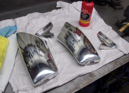 Rear fender stone guards for the sidescreen cars (TR2-TR3B) look simple enough, but like most everything else regarding restorations, those looks are deceiving. New reproduction stone guard sets are currently available, but they’re only a starting point. Though much better than beginning with flat sheet aluminum, they still have to be “fitted”, and this always involves trimming and filing away the excess edge material that remains after being drawn over a form. This is actually a good thing, as most of the fenders today have had some rust or collision or rust repair in this area, and chances are pretty good that the repair will not perfectly match an original factory profile. Now what gets most folks into trouble is that they wait until the car has been painted to install these stone guards, and now the fitting must be done on top of fresh paint. Believe us when we say that the process will go a whole lot smoother if you perform the “fitting” BEFORE any of the final color has been applied! And to take this one step farther, the new reproduction guards should also be polished to bring out a shine like this, and metal polish is not something that you’ll want to rub onto your new paint. Therefore, polishing like this (on the bench before installation) is another place where you can save yourself much grief later on!