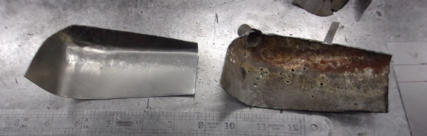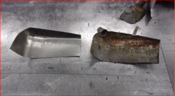 We have mentioned this here many times in the past, but it’s worthy of a mention yet again. Metal shaping is a critical skill to have when performing restorations of vintage autos (and just about every other antique piece of metal). First to come to mind are the exterior body panels which are the “seen” areas, but there are plenty hidden places which always need these skills as well. These fancy molded pieces are the lower outside corners of the TR4-TR6 cowl vent plenum chamber (fresh air), and they always rust out when the small drain tubes (red arrow) become plugged with dirt and debris. Look closely and you can see several small pin holes where the metal is gone from the original piece (right side). Then look carefully at the new replacement patch on the left, after a flat piece of metal has been stretched (and shrunk) into the complex shape needed to replace the damaged area. It still needs a new drain tube installed, and it’s quite a shame that all this marvelous effort will never be seen.