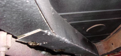 Here we have the lower edge of a TR3A gas tank. Look closely and you can see that the lower section of the tank has been covered in a layer of fiberglass, and this “repair” was applied along the entire bottom of the tank. It’s no wonder that the owner complained of a strong gas smell coming from his recently acquired and previously “restored” TR3A! Whomever performed the “restoration” on this car in the past must have used fiberglass as their rust repair of choice, because we’ve also noticed it poking through numerous rust holes in the floors!Many of you who are facing a rusty gas tank will opt to order a new replacement tank, but I want to present you with another option. We prefer to send all of our original gas tanks (no matter how bad they appear) to our nearest Gas-Tank-Renu franchise for repair. They can save even the worst original tanks at a cost that is usually less than the price of a new tank, AND the original tanks fit better than a reproduction tank ever will! The nationwide lifetime warranty they offer is a big plus as well, but in all the years we’ve been using their services we’ve only had one single warranty claim, and it was promptly and cheerfully resolved!