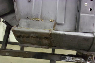 And now we have a properly completed repair. The entire outer sill (rocker panel) has been replaced with a new reproduction part, and the rusty lower section of the bulkhead end panel (kick panel) has been surgically removed and replaced with new metal. After aligning the new patch with the remaining original but solid metal, the pieces were TIG welded together with a continuous butt joint, free of any cracks,voids, or overlaps which might allow moisture in to start the rusting process all over again. We then grind away the excess weld, and leave a repair that will be nearly invisible to anyone who might disassemble this car again 50-60 years from now! Unlike a TR2-3B which has a heavy gauge inner sill to support the door posts and the floors, the only support that a TR4-TR6 body has in this area is a thin sheet metal box which is formed by the inner and outer sills and a small section of the outer floor pan, so it is imperative that any rust in this area is repaired in a manner to assure it is structurally sound. The previous “repair” certainly was not!