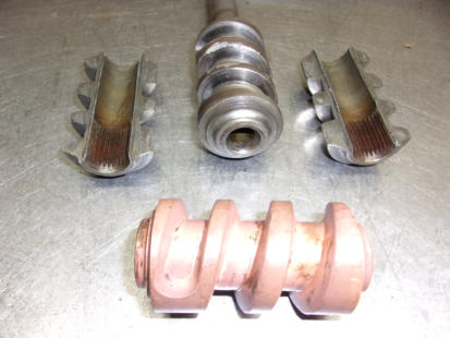 We get a fair amount of TR2/3 steering boxes sent to us for repair AFTER some other owner or shop has attempted the job themselves, but this is the first time we’ve ever seen it done this way! Changing the worm gear (when required) is a specialized operation, and we have developed special tools and procedures for doing so in a fast and efficient manner. Originally, the worm gears were fed onto the lower steering shaft, and then the end of the shaft was flared (like a steel brake line) to keep the gear tightly in place. Apparently the shop who attempted to replace this one could not figure out how to “un-flare” the steering shaft and release the old worm gear, so they ground through the entire length of the old gear along both sides and cut the worm in two to release it. I just hope they weren’t charging the TR3 owner by the hour while performing this painfully slow process! I don’t know how they got the new worm installed, but it was not tight and the steering was erratic, so it ended up here to be done correctly. We did not like all of the cuts and grinding marks they left in the shaft either, so we provided a replacement shaft without the battle scars in the interest of safety.