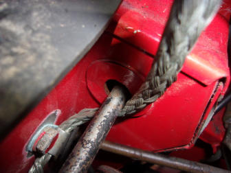 The round black steel rod here (with the paint flaking off), is a TR6 throttle shaft, where it exits the firewall on the left side. This rod is part of the gas pedal, and it runs across the firewall just behind the engine. What’s interesting here is that the small plastic bushing which is supposed to hold the rod as it passes through the firewall (in the middle of the big red “flat washer”) is missing. The opposite end of the rod on the right side of the firewall is also supported by one of these same bushings (also missing on this car), next to the lever where the carburetor linkage is attached. With the passage of time, it’s not uncommon for these bushings to crack and fall out, leaving you with a sloppy gas pedal that won’t fully open the carbs. Many times, when owners bring their cars here with complaints of a “loss of power”, a new set of throttle shaft bushings is all it takes to resolve the problem. But this is the first time we’ve ever seen the battery ground cable used to support the shaft in place of a missing bushing! What will they think of next? Normally, it isn’t a good idea to allow anything near the throttle (or steering) shaft that could snag or prevent unrestricted motion.
