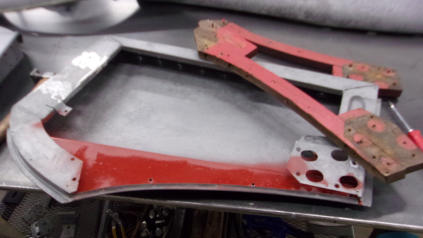 We’ve been doing a pretty good job of repairing rusted and slightly bent frames here with hastily fabricated jigs and guides to suit each different frame needing attention. But lately we’ve seen an increase in the number of frames that have a problem, so we decided to build a special frame table that would allow us to take precision measurements more quickly for comparison to the factory drawings. The solution was a 975# slab of ¾” thick steel that was flat and true, mounted on top of a rigid steel frame and a set of very expensive locking wheels. We drilled and tapped several strategic locations to accept mounting blocks that would elevate the frame a consistent distance above the surface, with provisions to clamp the frames down securely for repeatable measurements throughout the straightening and rust repair process. The first frame to be repaired on this new table came out perfect, and the body dropped back on like butter!