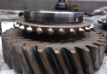 To the untrained eye, and at first glance, this appears to be a “good” TR3 second gear. All of the big teeth are smooth with no nicks or chips, but it’s always the smallest details that matter most. Take a look at the row of tiny teeth above the big ones, and a closer examination shows them to be worn away by nearly half. These smaller “dog” teeth are what actually complete each gear change when they engage with the synchronizer. When your brass synchro cups (rings) get worn to the point that you hear a small grind when changing gears, it’s these small dog teeth that are slowly being destroyed. If this is happening with your own TR, don’t keep driving it! As this damage and wear gets worse, the transmission with start “jumping” out of the affected gear, on downshifts at first, and then as the wear continues it will also jump out during acceleration. Unfortunately there is no spec to measure how much wear is too much, so absent an owner’s complaint or on a car we can’t test drive, we have to rely on the experienced eye of our gearbox specialist to know when a new gear is required.