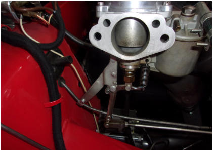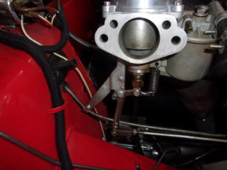 on the FRONT carburetor, so the cable has a chance to straighten out after passing through the