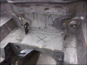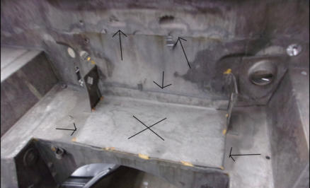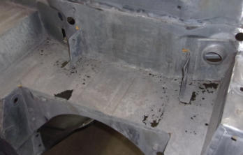 This battery shelf has received a “repair” in the past that isn’t too bad, but still leaves a lot of room for improvement. The flat piece on the bottom was at least bent up along the back edge to seal the rear corner, and brazing (gold spots) assured that it would stay securely in place, but nothing was done about sealing the reinforcement channels in the bottom. Leaving these open will allow heat and fumes from the engine bay to travel back to the rust holes, eventually making their way into the passenger compartment. Even worse are the upper holes at the approximate height of the battery. These come from spilled acid or acid vapor exiting the battery caps, and is generally caused by an over active charging system “boiling” the battery. Now you can see the importance of the tall rear wall of those battery box liners we’ve been talking about! When the firewall rusts out in this upper location, it feeds acid and engine fumes directly into the fresh air plenum, which then directs all this nasty stuff through your heater and dash vents (TR4-6). This is not something you want to have blowing in your face, or breathing through the heater when the windows are up and the heater is cranking out warmth on a cool morning!