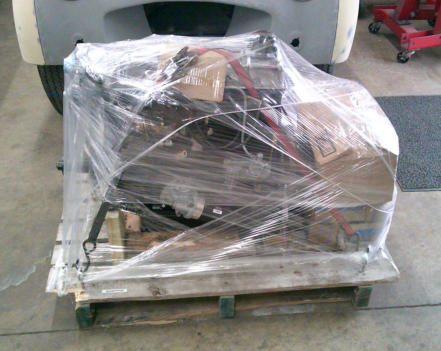 It’s well known throughout the Triumph community that we rebuild a huge amount of TR2-TR6 engines, and many of them are shipped here from all over the USA. For those of you located some great distance from Southwest Ohio, it’s pretty easy to strap an engine onto a pallet and have a freight company take care of the logistics. This is a TR3 engine which we recently overhauled for an owner in FL, all wrapped up and ready to ship home. Usually we’ll receive an engine laying on it’s side (after draining fluids), but we have to be a little more careful for the return journey home. We like to make wooden wedges from 2x6 or 2x8 boards, and bolt the front motor mount tabs to the pallet through them. Those wedges and a couple of diagonal metal straps at the rear (threaded into the block’s bellhousing bolt holes) will keep the engine from rocking side to side and falling over. We’ll also install a few small 2x4 blocks around the 4 flat sides of the oil pan, just to make certain that the engine doesn’t slide around on the pallet. After that, all that’s needed is to strap and shrink wrap the entire assembly, then call the truck. We’ll close this little story by mentioning that this engine arrived home safely 3-4 days after it left our shop. Now you know that there’s really no reason to have your engine rebuilt by anyone with less Triumph experience than is available here at Macy’s Garage. And if you don’t want to remove the engine yourself, you should know that shipping a whole car is actually easier than shipping an engine by itself. Send the whole car and we’ll handle the R&R for you as well!