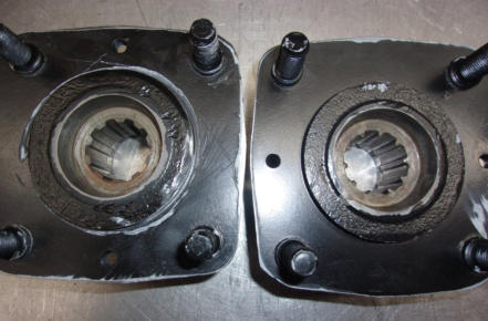 Rear axle flanges on the “Girling” brake cars are held in place with a taper, which is usually as tight as if they had been welded on! Getting the flanges off of the axles to change seals and bearings is usually a real fight, with plenty of four letter words involved. But with the earlier TR2 and TR3 with Lockheed drum brakes, it’s an entirely different matter. The axle flanges are installed via a course spline, and held in place with a washer, BF Nut, and a cotter pin. Remove the pin, nut, and washer, and the hub will slide right off of the axle. The bad news in all of this is that they can also become loose. Whether it’s from not torquing the nut tight enough or from leaving the cotter pin out doesn’t really matter. Just as with a wire wheel spline, any spline which isn’t tight can wiggle and wear. If left to do so for too long, the part(s) will be ruined. The hub on the left has a perfect spline, square cut and flat on the tops of the splines, but look closely at the hub on the right and the worn/sharp pointed tops of the splines can easily be seen. This one had been loose for a very long time, and more importantly for quite a few miles before the car was parked in a barn and forgotten. We wonder if this is the reason the car was taken off of the road, for it surely would have made a loud clunk that was hard to ignore. New replacement hubs are not available today, and good used parts are extremely difficult to find. With that in mind, if you have a Lockheed brake car, check your rear hub nuts annually!