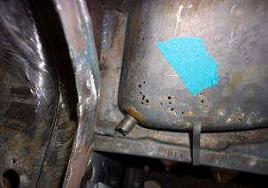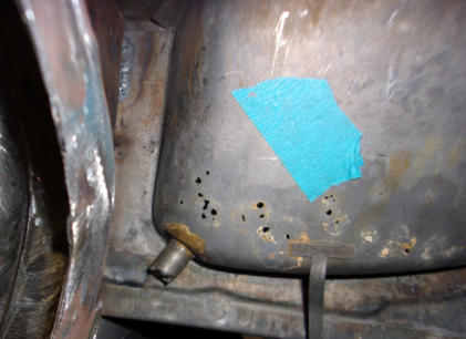 Cars can and will rust in some strange places, often places where you would never think to look. Not until you notice water on your carpet after a car wash or a drive in the rain would you start an investigation leading to this spot. This is the lower outer corner of the scuttle plenum, or in other words the chamber under the cowl vent that feeds fresh air to the heater and vent system of a TR4-TR6. You can see the little hose nipple in the corner. This is supposed to collect any water that enters the plenum from above, then drain it out at the rear edge of the front fenders. Inside the plenum is an area which never received any paint from the factory, all bare steel so it’s going to rust. Rust flakes and any other dirt and debris which enters through an open vent (or TR6 plastic grille) will clog the tube and hold the water inside, accelerating the rust until it breaks through like this (or more). We’ve had cars with this whole corner missing. Debris can also clog the drain hole at the bottom of the fender, and when that hole clogs, it’s a major contributor to the front fenders rusting along the lower edge.