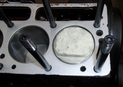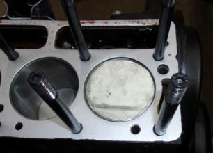 We are presently rebuilding a TR6 engine that had previously had a large amount of work done (at an MG shop!) and wouldn’t run very long without bending pushrods. The most recent work was a camshaft and cylinder head package, and nothing done to the short block. We pulled the head and found the cylinders to be terribly scored, but no indication of valves touching the pistons to bend the pushrods. That was caused by a couple of valves seized in the valve guides, a problem we’ve also seen in the past when using bronze valve guides. So, it needed a full and complete rebuild. On reassembly, we found that the head had been shaved by a huge amount, resulting in the push rods being too long for correct valve adjustment, also a contributing factor to the bent pushrods. The previous new camshaft was badly scored, so we replaced the camshaft as part of the rebuild. Which brings us to this week’s photo. Needing to make sure that the severe head shave would still allow the valves to clear with a different cam, we performed a “clay the pistons” test. Modeling clay is placed on top of the pistons, and the head is installed with rocker shaft/pushrods adjusted. Then you crank the engine over by hand and disassemble to measure the thickness of the clay and verify the valve to piston clearance.