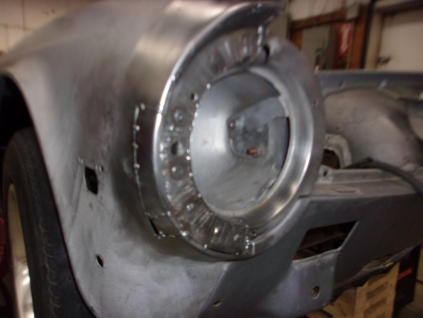 Every car has “typical” places where they will rust, and the headlight area of a TR6 is one of them. Believe it or not, the top of the tires will actually fling water, snow, salt, dirt, etc. forward, and there is just enough of a pocket here to collect it and promote rust. Think back to the 1955 and 1956 Chevy’s that were common when I was in high school. Only about 14-15 years old at the time, and most of them in Ohio were rusted above the top of the headlights. If not, they had already been repaired by the “cap” patches that sold like crazy through J. C. Whitney or the Western Auto stores. Unfortunately, “caps” are not available for the TR6 front fenders, so we have to create them in our metal shop. This is also an area where 3 different pieces come together in layers, so we make our repair pieces in three layers to match. While many will still lay screen wire in here and slather it with Bondo, basically sculpting the “repair” from filler, a replacement cap made in the same manner as the original is really the only correct way to save an otherwise decent fender for continued use on a beautiful TR6 restoration.