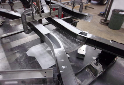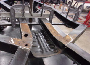 Week two of our 3 week look into this TR6 frame repair. In actual time, this only took 2-3 days and cost the client less than $2000. Much better than the $7k plus he was looking at for a completely new frame (plus options and shipping!). You can plainly see where the weak sections have been removed from the two central rails, and the inside of each box has been cleaned and painted. Look close and compare this to last week’s photo and you can see that both trailing arm mount sections and a large portion of the outer perimeter frame is missing from the upper right corner of this week’s pic. There is no need to be concerned about repairing a frame like this because a close look at any frame will show that they were originally fabricated from many smaller pieces that were welded together. The factory had a jig to hold all of the pieces in alignment before they were welded, and the new frames which are available for that $7k price tag are made by the same exact process. We too have our own flat frame table and jig to hold all of the pieces in alignment, so all frames repaired here will be just as strong and true as a good original or a 100% new frame. The only thing lacking is the high cost!