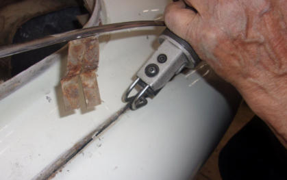 Just about anyone with a few basic tools can tear an old car apart. Whether it ever goes back together again is another matter. Part of that equation is the care and finesse that goes into the disassembly process, as you really should pay close attention that nothing more is damaged in the process. There’s already enough that will need work without creating more by a ”take no prisoners” approach. Destroy some hard to find part through careless disassembly, and your restoration might come to a halt before it really gets started. We like to call our process a “surgical disassembly”, and we take our time to plan and avoid inflicting any additional damage. This photo shows a TR3A which recently arrived for a complete restoration. It has been one of the most difficult disassemblies we’ve ever experienced. Every single bolt holding each of the four fenders needed to be cut off, and here is just one of the tricks we used. A small air saw and a tiny reciprocating blade will just fit between the body tub and the fenders, allowing each of the frozen bolts and spinning cage nuts to be sliced apart without damaging either panel. Time consuming, yes. But so is repairing fenders and body tubs that were carelessly damaged.