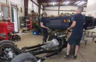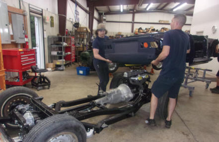 the big “pile” of parts begin to resemble a Triumph TR once again! Two strong young men can
