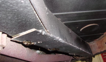 Rusty frames are a common ailment of TR4A-TR6 (IRS cars), and this is a good example of how NOT to “repair” them. Scabbing a piece of new steel over an old crumbling frame section might give you a warm and fuzzy for a short time, but it offers questionable strength to this critical component of your Triumph. We’ll even go farther and mention that a “repair” like this will actually hasten the demise of your frame, as it creats an improved moisture trap between the layers that will accelerate the rusting process. The same is true for body panels which have been “repaired” in a similar manner. Far too many times we have seen cars repaired in this manner (frames and bodies) advertised as “no rust” and the sellers must think that if you can’t see it, it must not be there. This is why we always recommend that you NEVER buy a TR4A, TR250, or a TR6 without giving it a thorough inspection, and the bottom side is more important to check than the top. And if you have a car like this or recently purchased one, remember we have the most experience with making these types of repairs CORRECTLY.