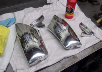 Rear fender stone guards for the sidescreen cars (TR2-TR3B) look simple enough, but like most everything else regarding restorations, those looks are deceiving. New reproduction stone guard sets are currently available, but they’re only a starting point. Though much better than beginning with flat sheet aluminum, they still have to be “fitted”, and this always involves trimming and filing away the excess edge material that remains after being drawn over a form. This is actually a good thing, as most of the fenders today have had some rust or collision or rust repair in this area, and chances are pretty good that the repair will not perfectly match an original factory profile. Now what gets most folks into trouble is that they wait until the car has been painted to install these stone guards, and now the fitting must be done on top of fresh paint. Believe us when we say that the process will go a whole lot smoother if you perform the “fitting” BEFORE any of the final color has been applied! And to take this one step farther, the new reproduction guards should also be polished to bring out a shine like this, and metal polish is not something that you’ll want to rub onto your new paint. Therefore, polishing like this (on the bench before installation) is another place where you can save yourself much grief later on!